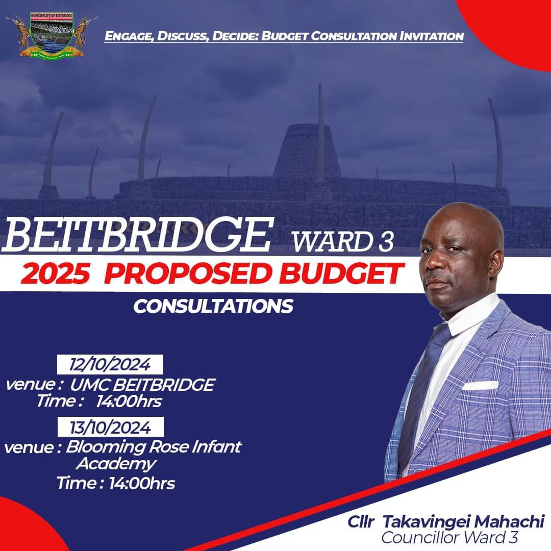Beitbridge, Zimbabwe – Ward 3 Councillor Takavingei Mahachi is calling on residents to actively participate in the upcoming 2025 budget consultations scheduled for October 12 and 13, 2024, at various locations including Tshidixwa, White Lodge, Siyoka, and Mabidi Suburbs. The consultations aim to engage the community in shaping the proposed budget for the 2025 financial year.
