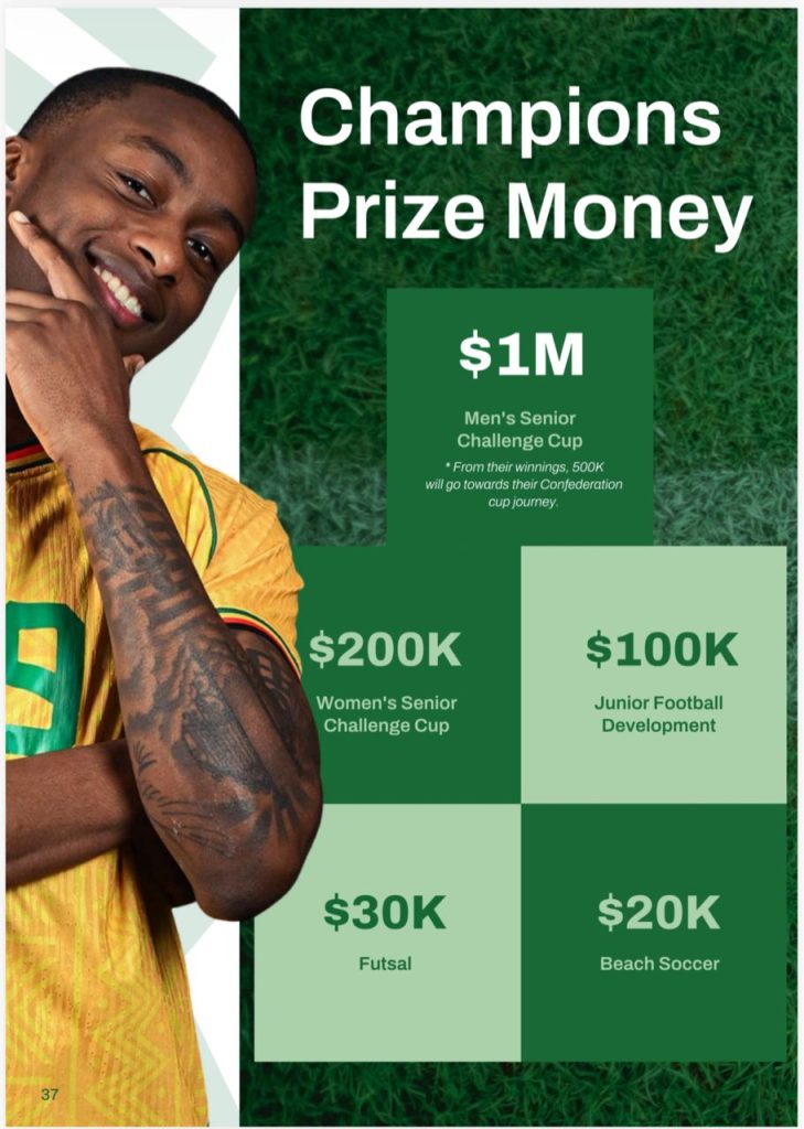The champions of the women challenge Cup will walk away with USD $200K, beach Soccer with $20K, Futsal with $30k and junior challenge Cup category champions with USD $100K.