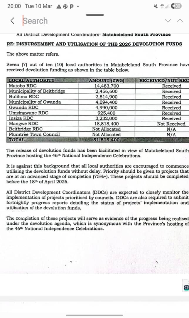 THE Government has allocated ZiG51815400 devolution funds to seven (7) out of ten (10) local authorities in with Mangwe benefitting the most.
