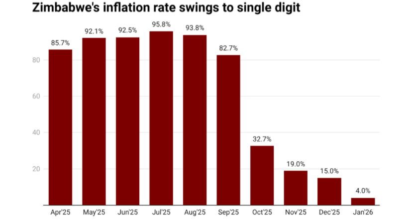 In January 2026, year on year ZiG inflation stood at 4.1 percent, while month on month inflation was recorded at zero percent.